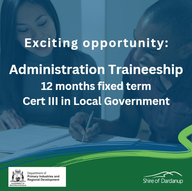 In partnership with the Department of Primary Industries and Regional Development (DPIRD) Regional Traineeship Program, the Shire of Dardanup is offering an exciting 12‑month full‑time Administration Traineeship for someone ready to start their career and learn how a workplace really works.