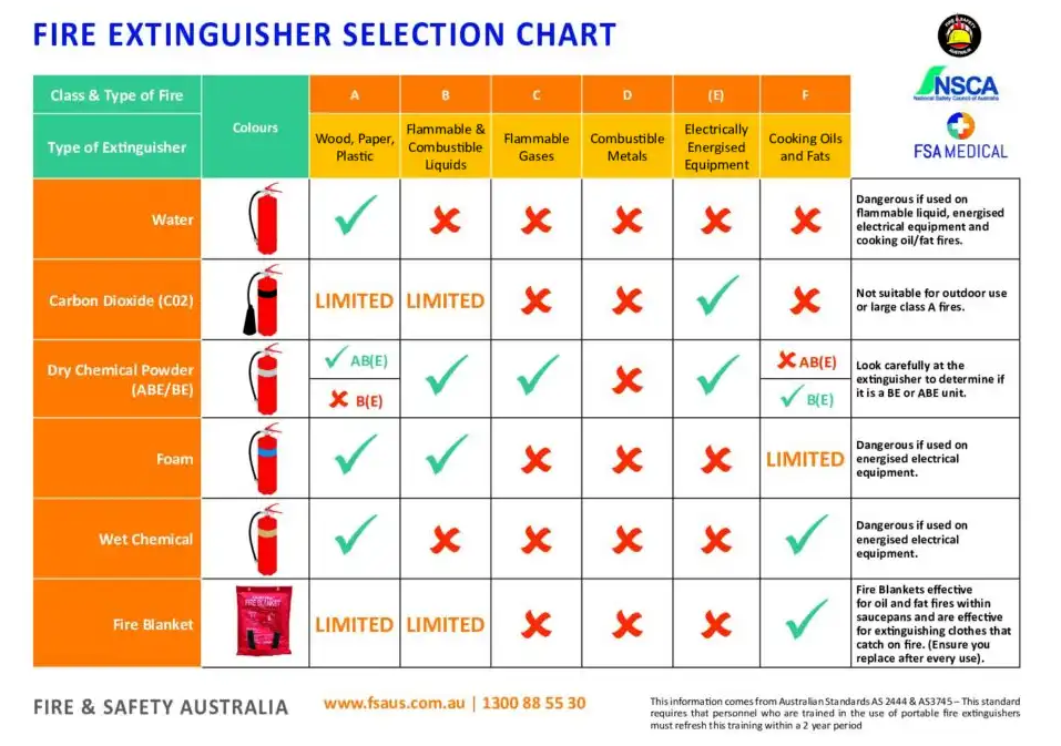 This chart visualises the fire extinguisher types used in Australia and the types of fire for which they are suitable, as well as their colour codes.