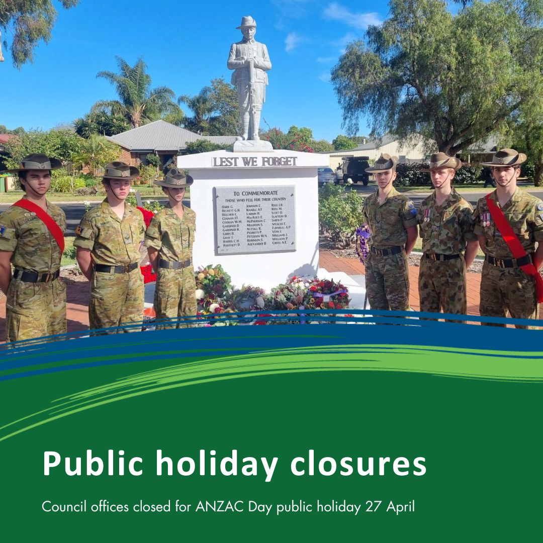 The Shire of Dardanup wishes to advise the community of changes to services and facilities for the ANZAC Day public holiday on Monday, 27 April 2026.