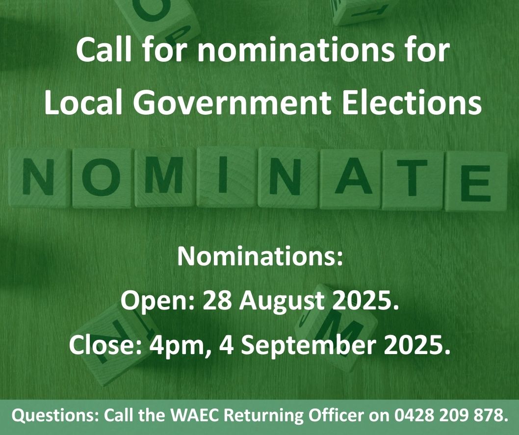 For more info visit the Candidate Resources webpage or contact Returning Officer Christine Elliott on 0428 209 878 or the WA Electoral Commission on 13 63 06.