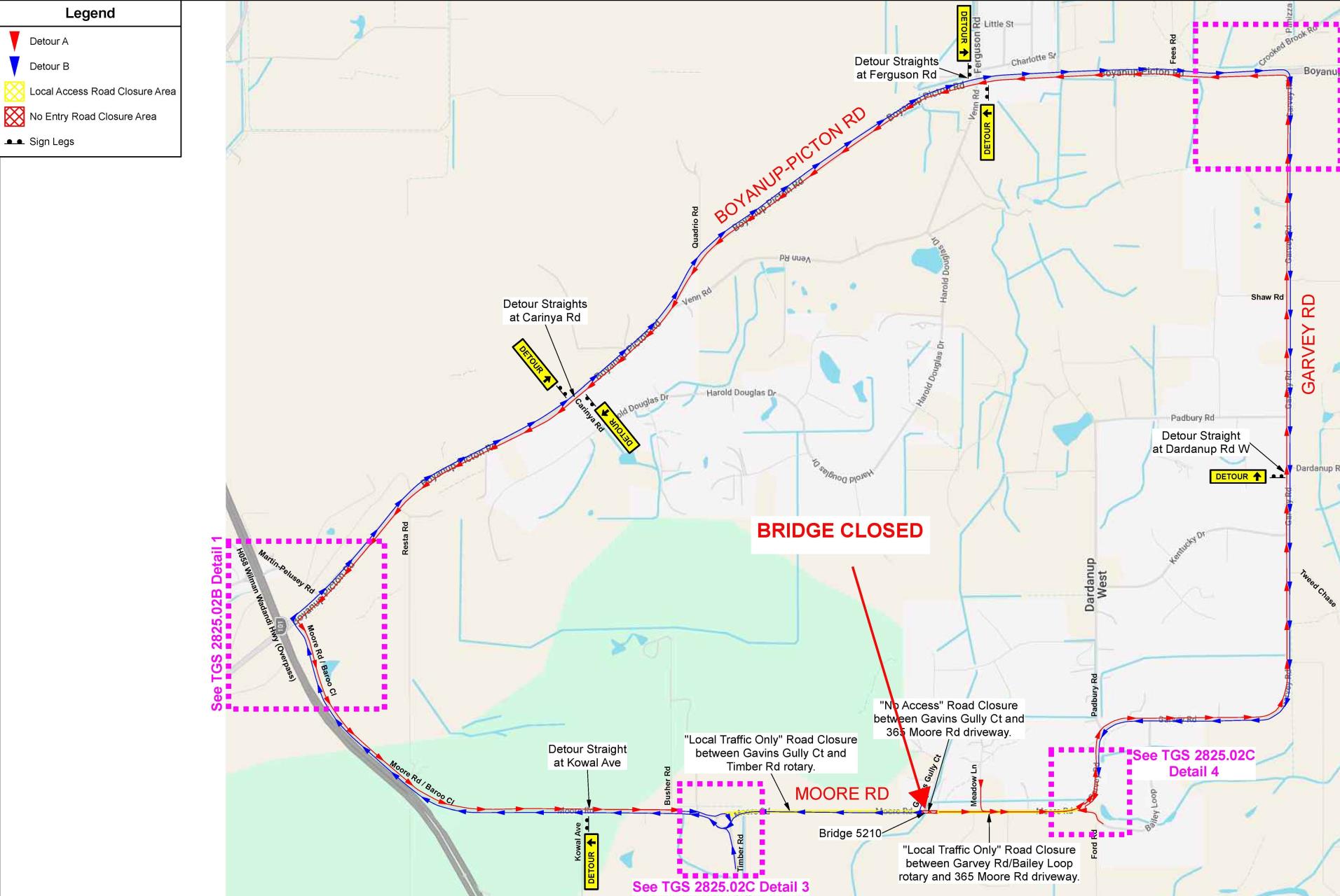 - Moore Road will be closed at the bridge from 7 April until 1 May 2026.