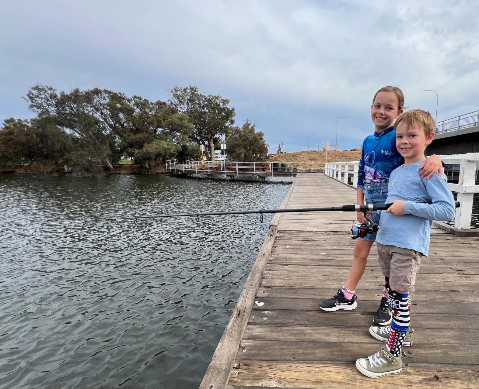 Caption: Young fishing enthusiasts Sophie and Hudson White check out the Shire of Dardanup’s Old Coast Road Bridge fishing platform which is now fully open to the public.