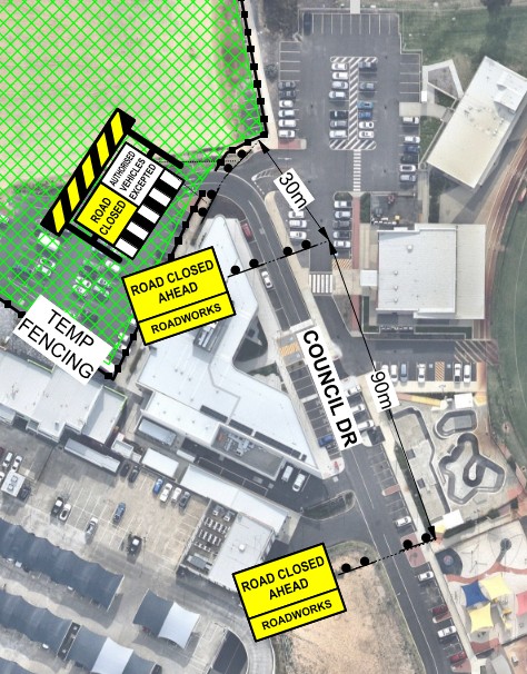 “Road Closed Ahead” signage will be in place along Council Drive prior to the car park