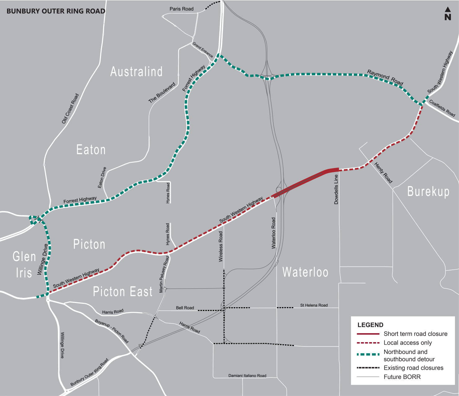 Southbound and northbound lanes on South Western Highway between Waterloo Road and Dowdells Line will be closed each evening for this 12-hour period.