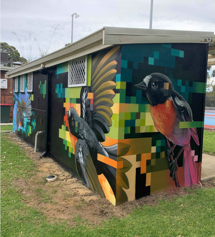The Scarlet Robin is a small red-breasted medium-sized bird that is found throughout South Western Australia. It has a plump and compact appearance and as with many robins, the male is physically quite different from the female. Males have a black head, neck and upper wings, with a conspicuous white patch above the bill (frontal patch). His breast is scarlet red and the lower underparts are white. The wings are barred white and the outer tail is also white. Females differ markedly from males, being brown above with a whitish frontal patch and an orange-red breast, brown wings and white underneath. Their vivid red feathers captured the attention of the Indigenous Noongar people of South Western Australia, who developed stories around the bird’s red coloration being caused by an aggressive Willie Wagtail punching the robin in the chest, causing it to bleed. The blood then trickled down from the wounded beak to the breast staining his chest red. The Scarlet Robin lives in woodlands and open forests. During winter, it will visit more open habitats such as grasslands and is often seen in nearby farms, urban parks and gardens at this time.